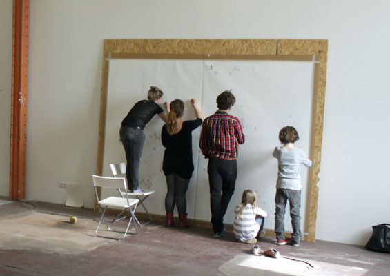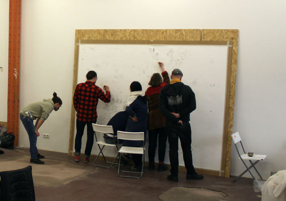 Über 50 Personen haben daran gezeichnet. Ein dezentes Hauptstraßengerüst auf einem großformatigem Papier diente als Einstieg und Rahmen für verschiedenartige räumliche Imaginationen der Stadt.